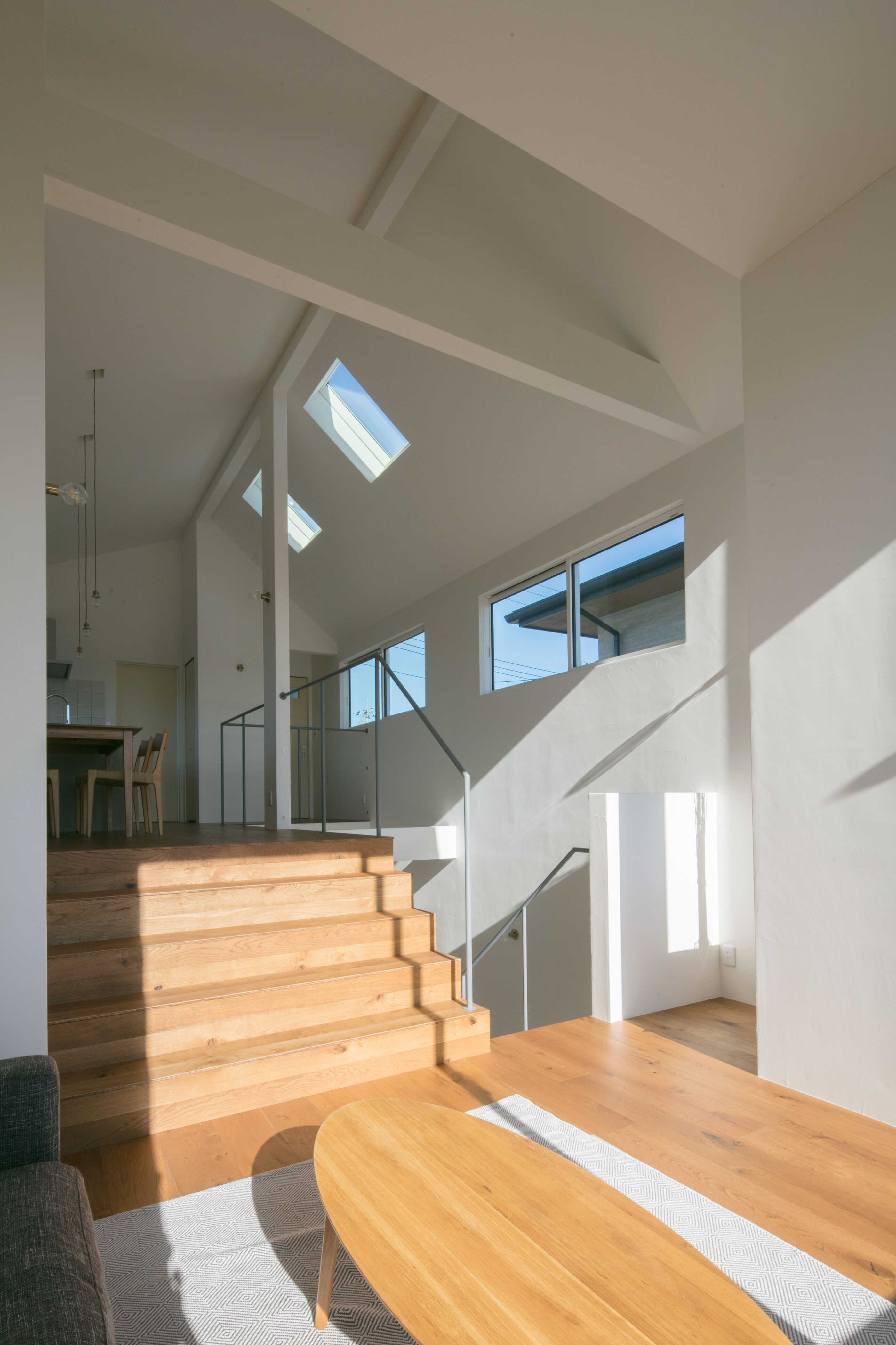 窓から注ぐ力強い光が、スキップフロアの段差に豊かな陰影を描き出す。