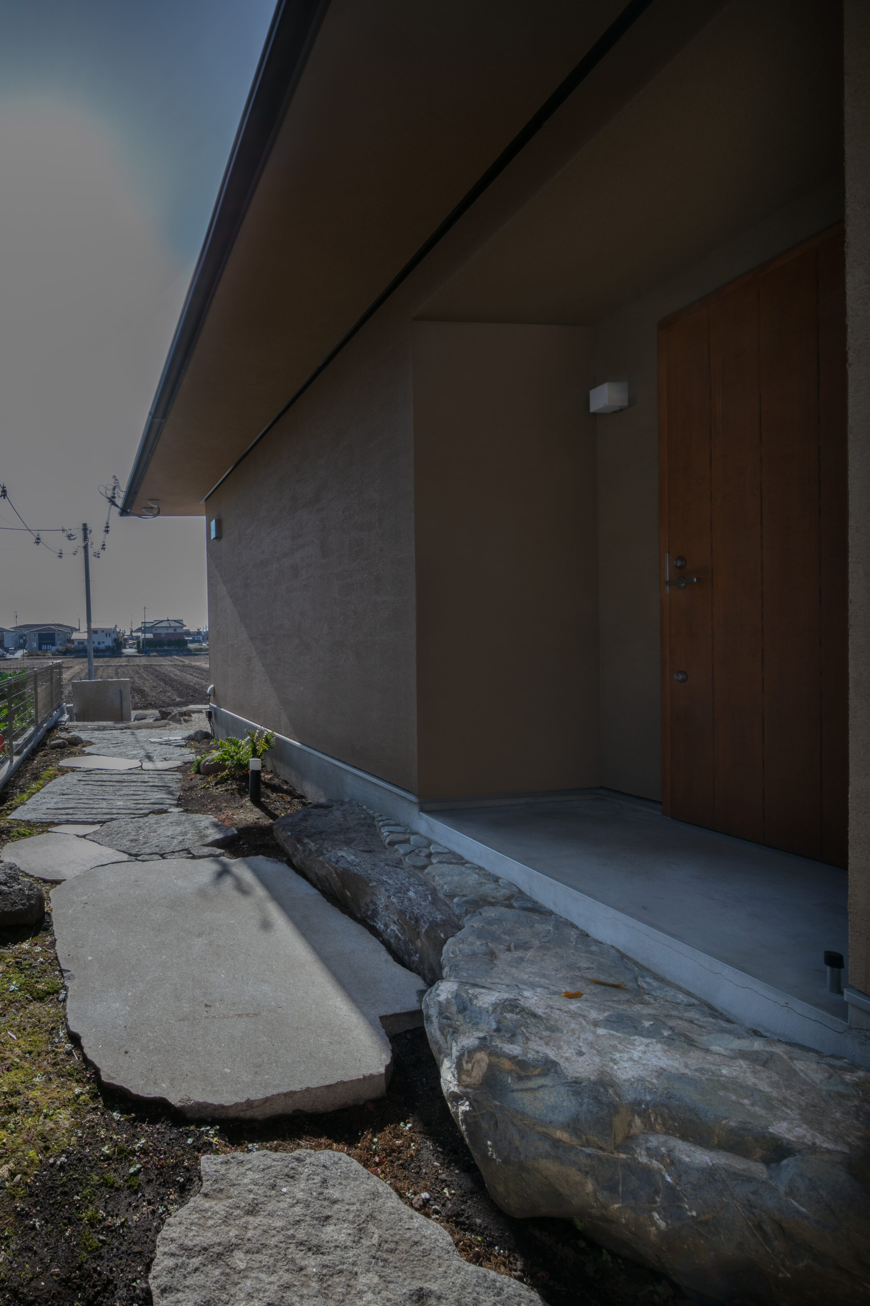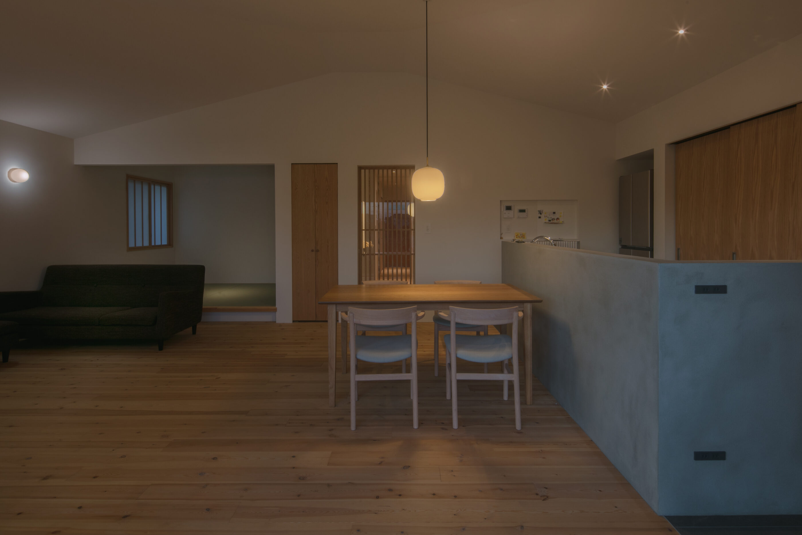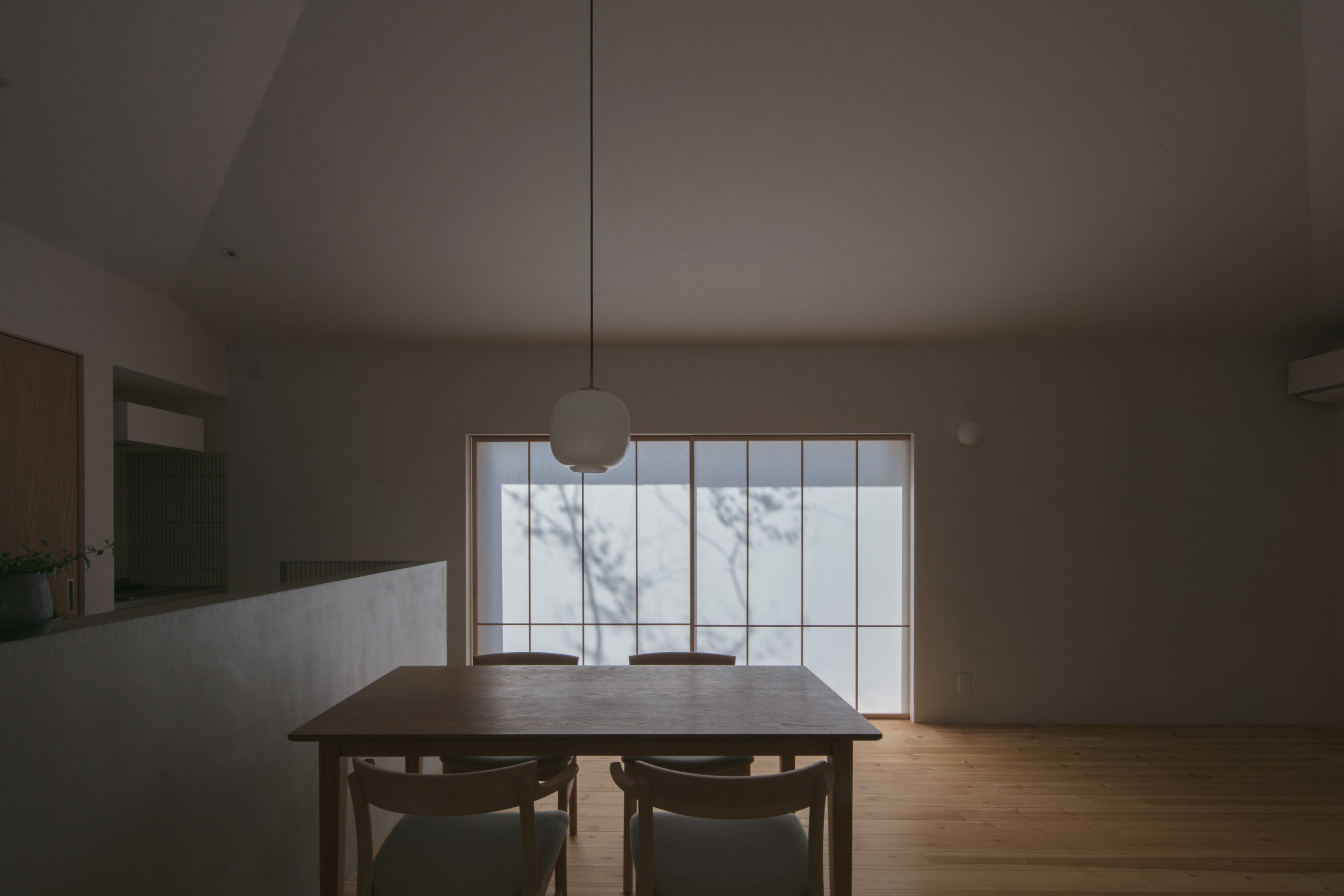 自然に囲まれた穏やかな土地に計画した住まい。周辺環境との調和を大切にしながら設けた大きな窓からは、瑞々しい緑や、季節ごとに表情を変える景色が室内へと穏やかに入り込みます。季節の移ろいを日常の中で感じながら、住まうほどに豊かさが増していく空間を目指しました。