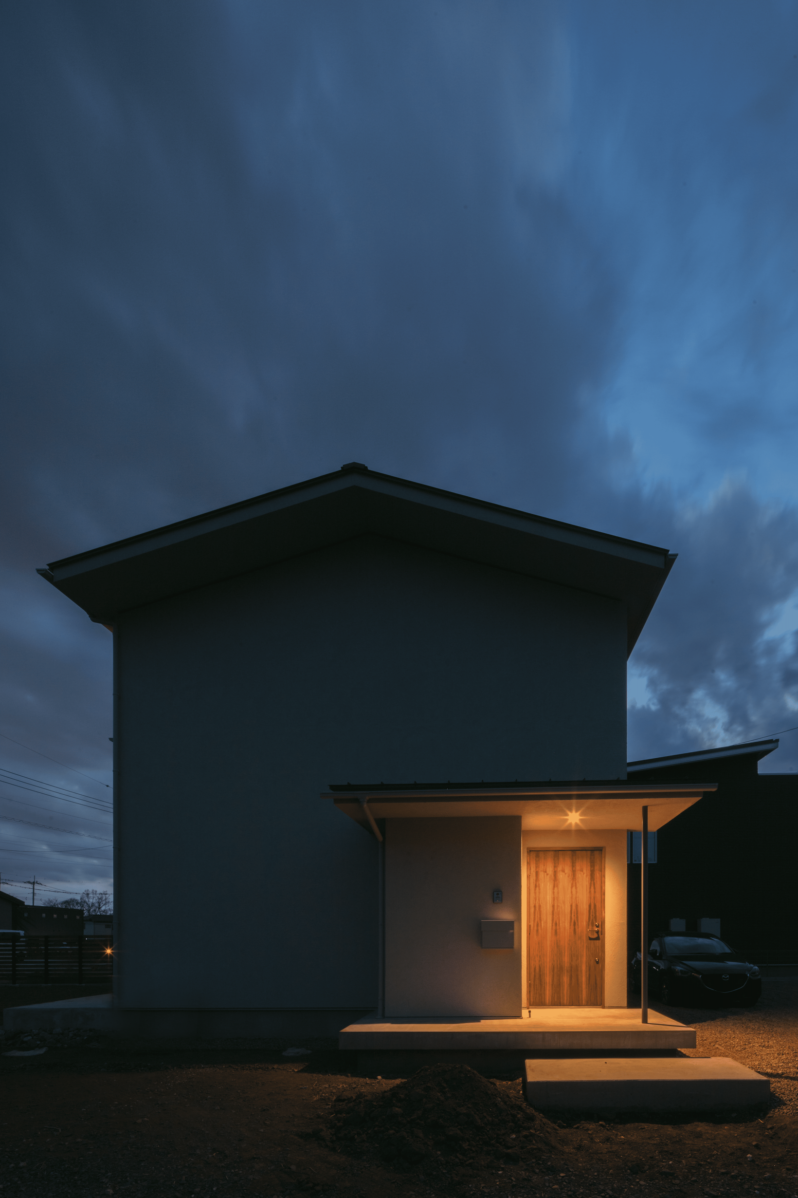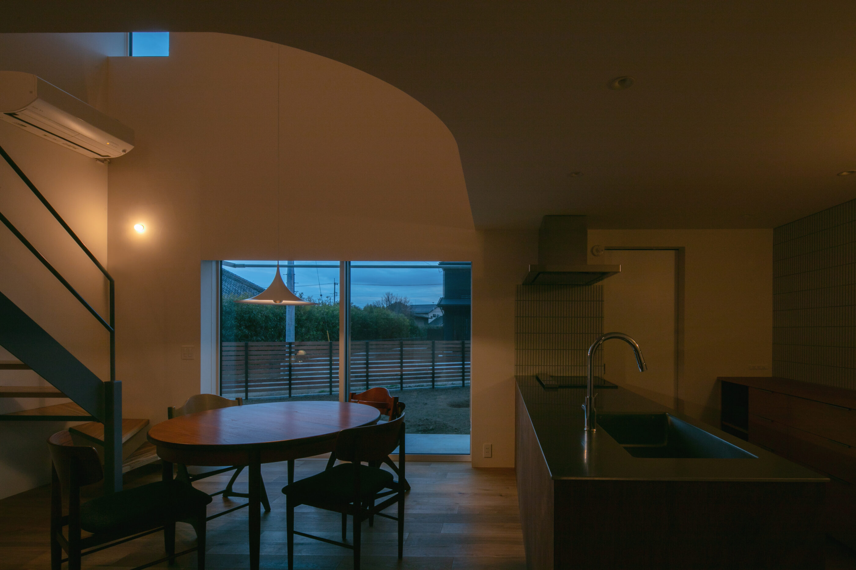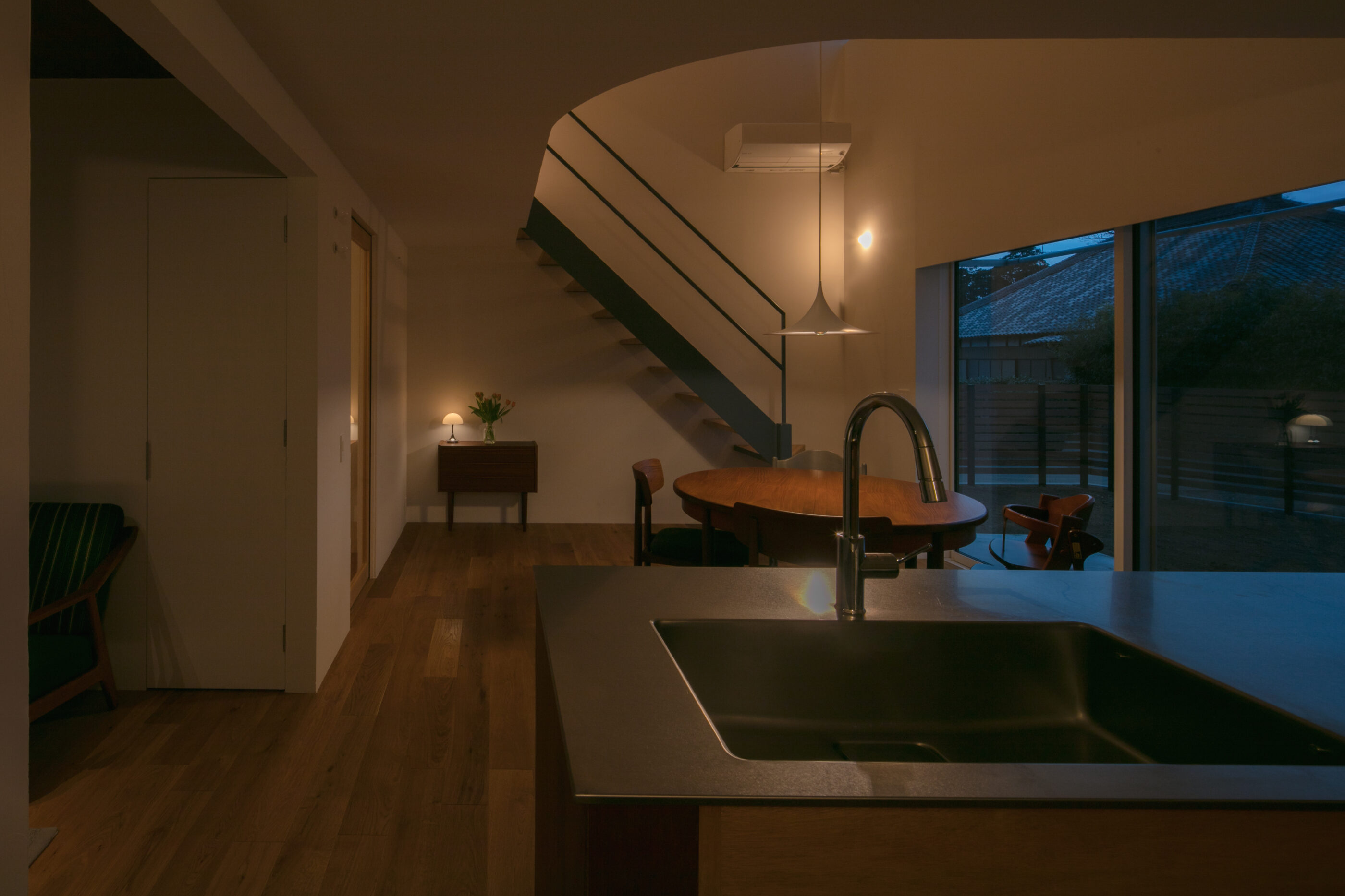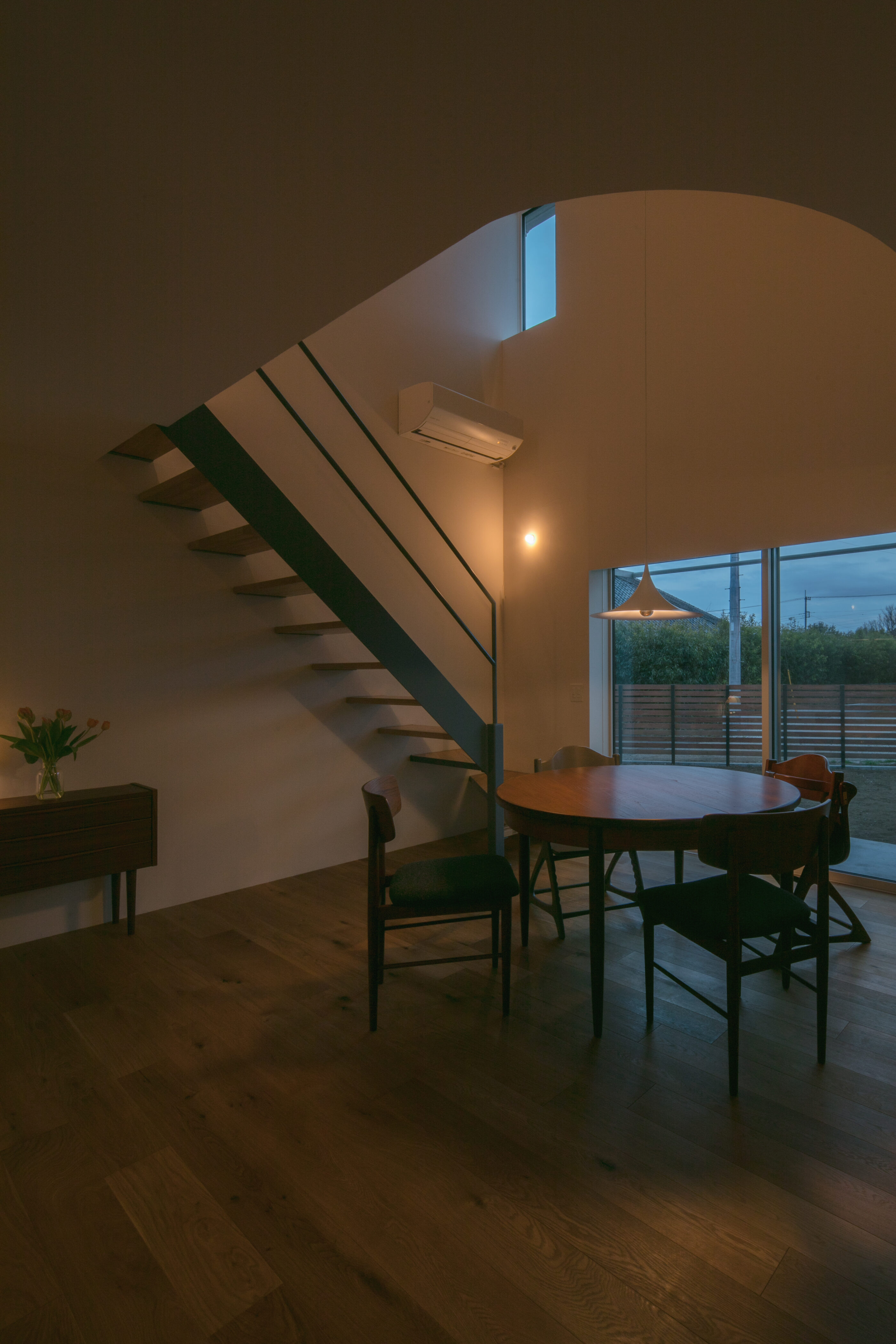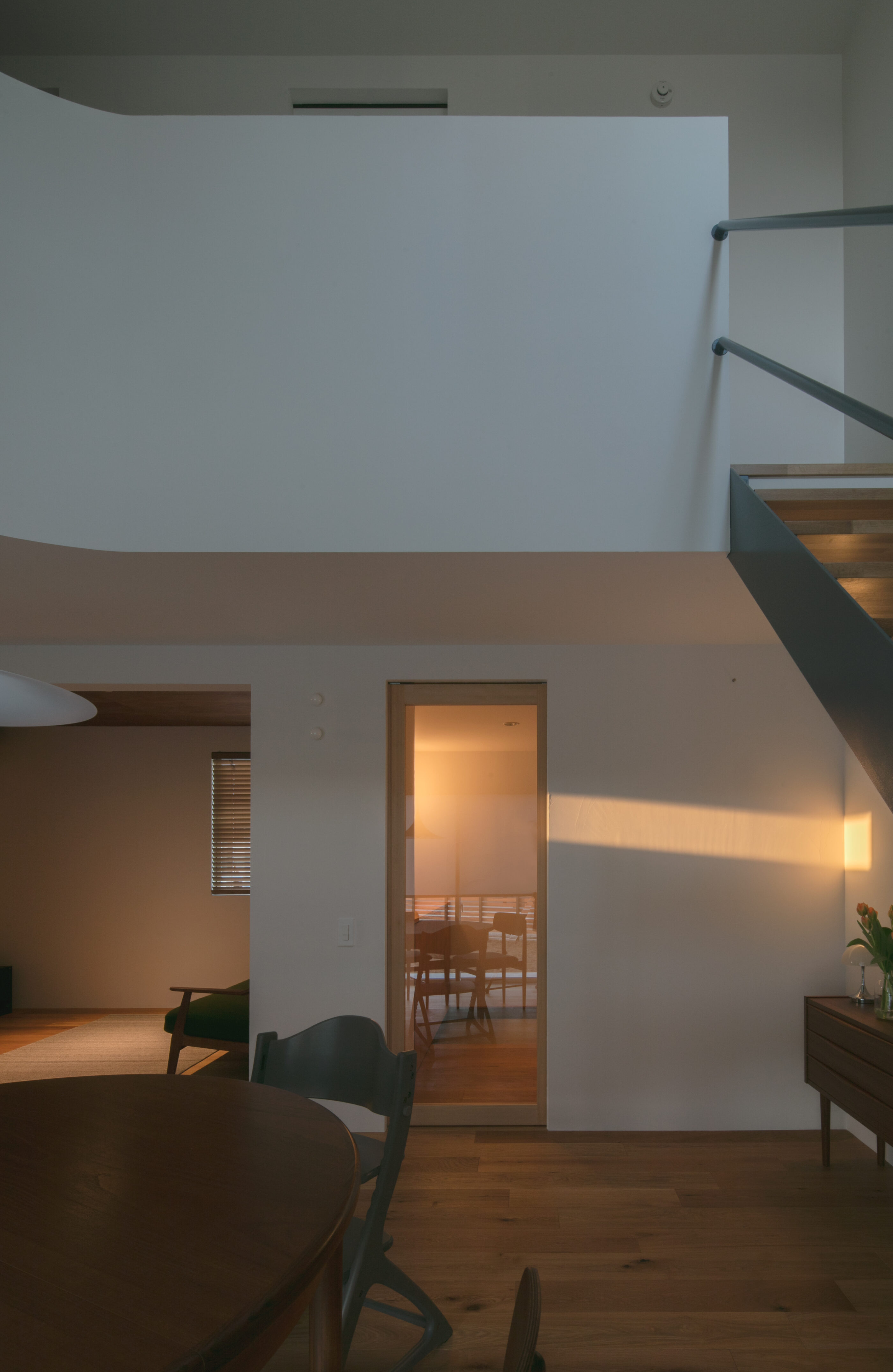 外の景色を切り取りながら、内にひらく穏やかな居場所をつくりました。光と陰影がゆるやかに移ろう、心地よい内包感のある住処です。