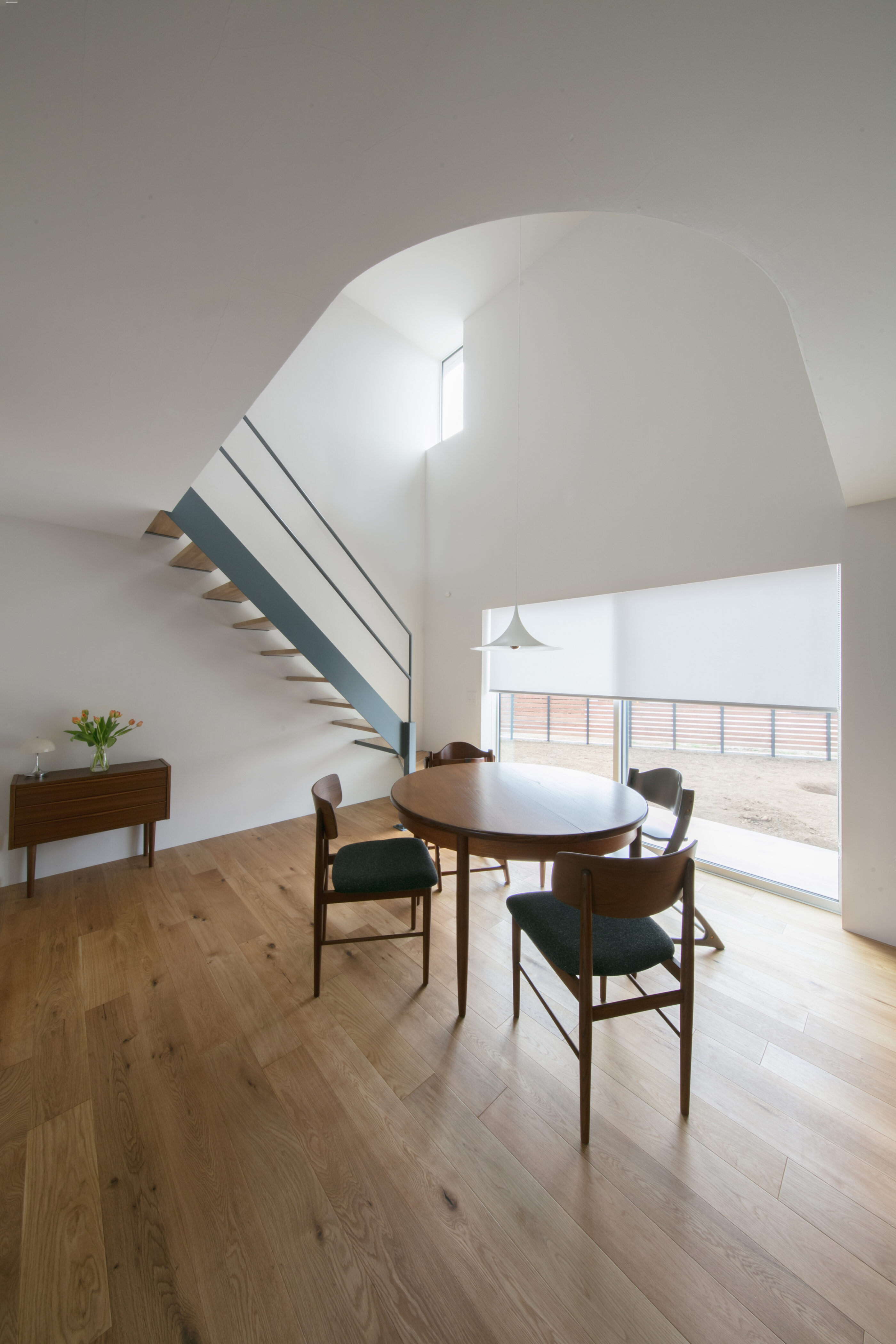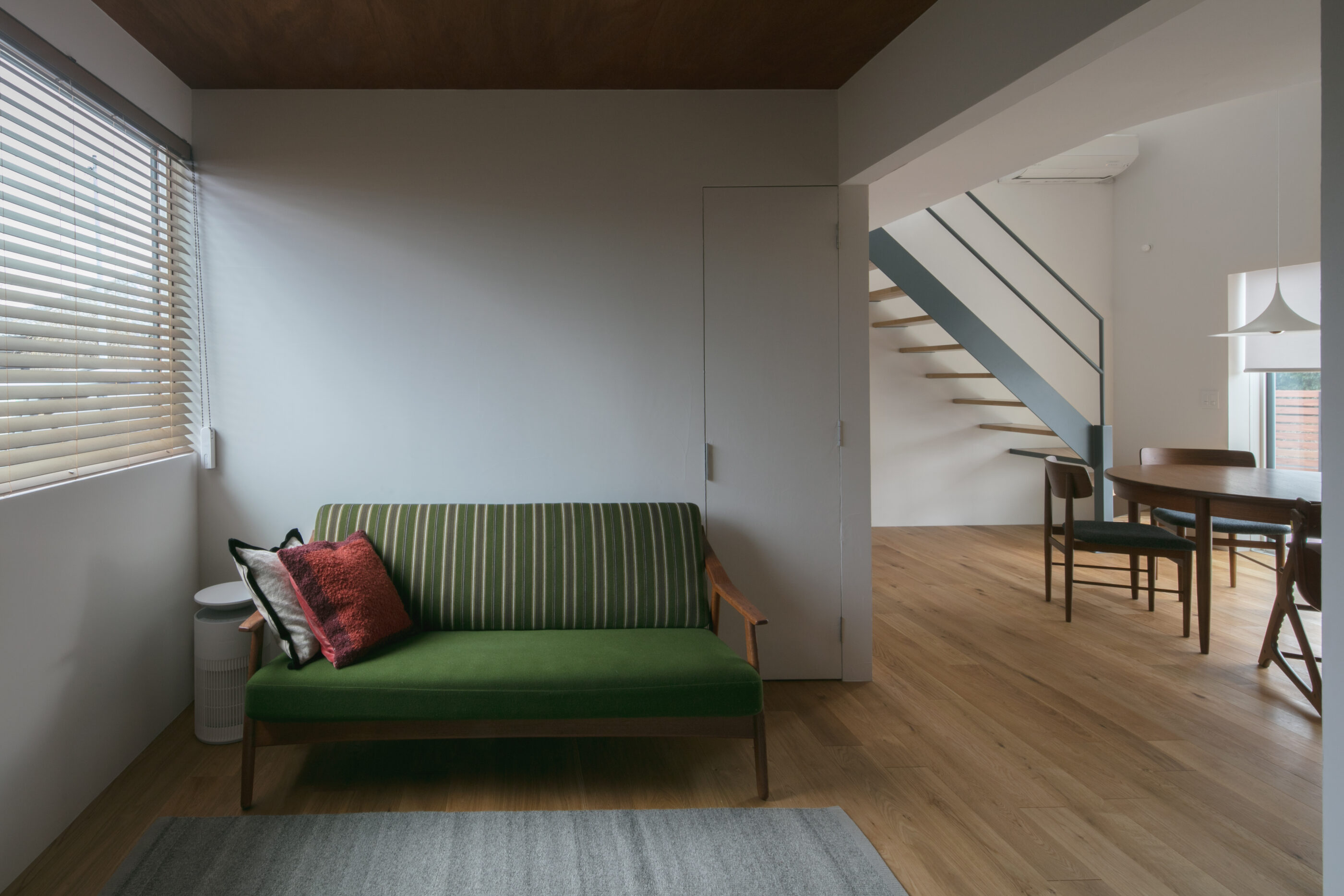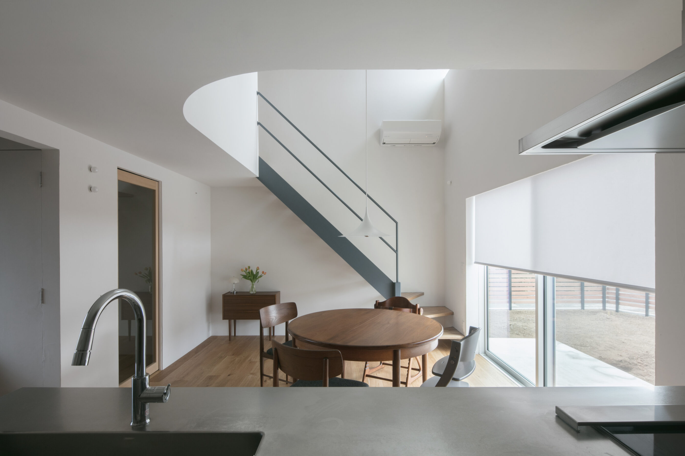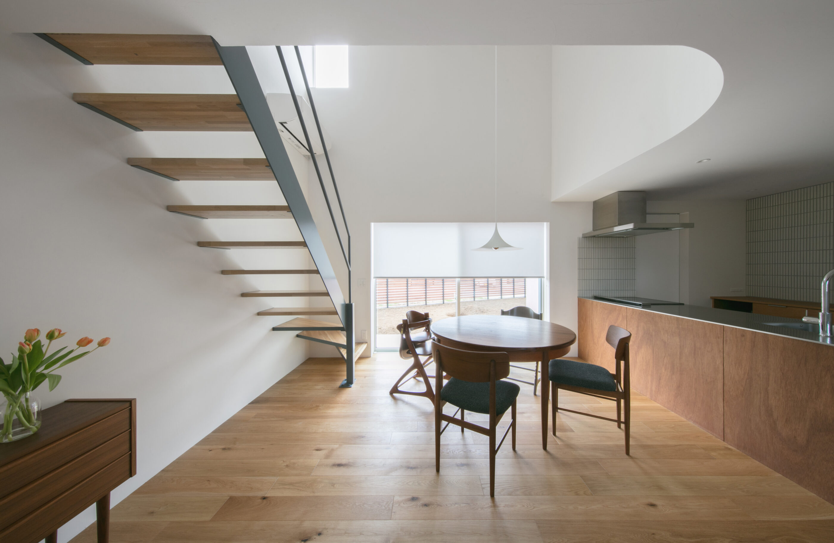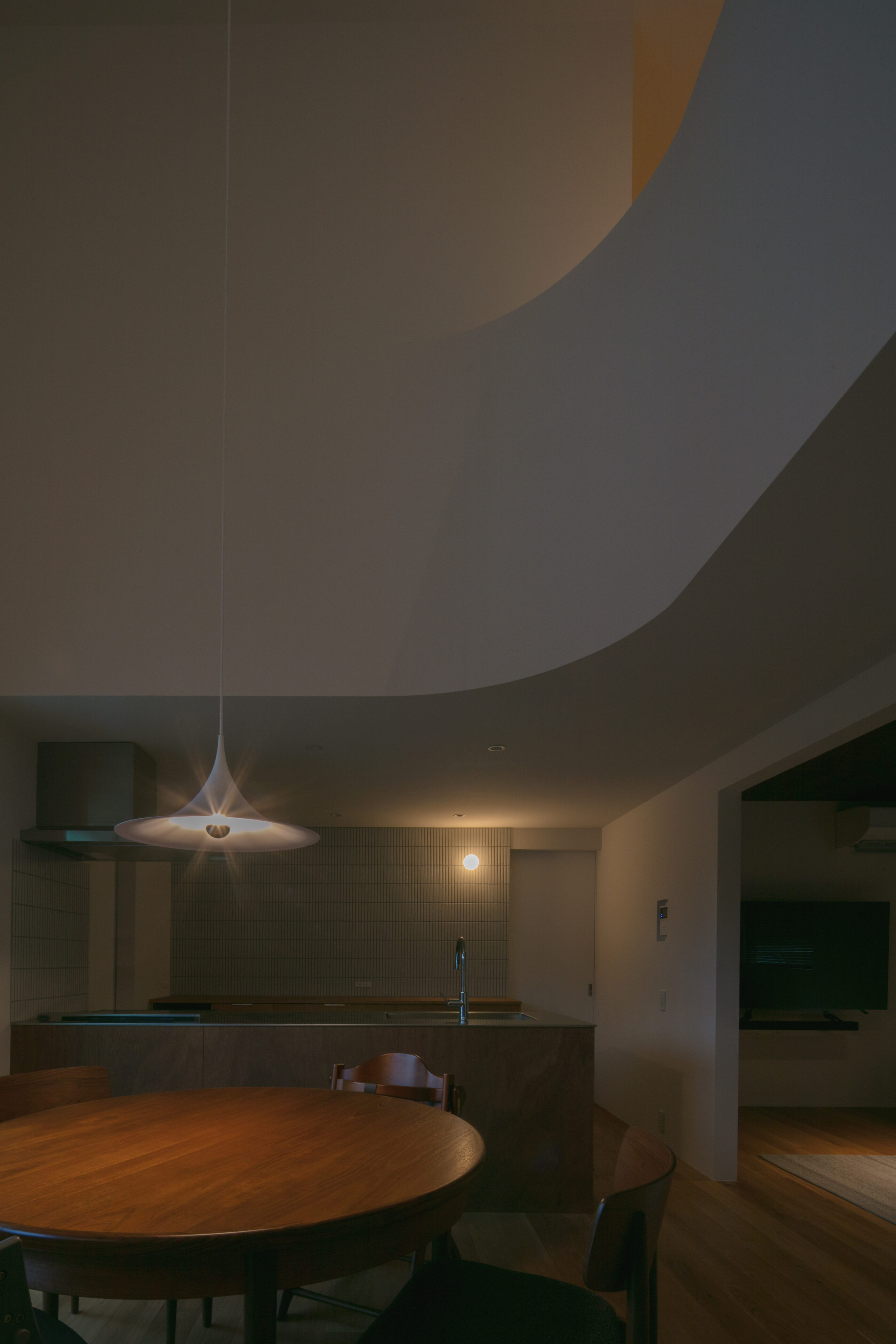 外の景色を切り取りながら、内にひらく穏やかな居場所をつくりました。光と陰影がゆるやかに移ろう、心地よい内包感のある住処です。